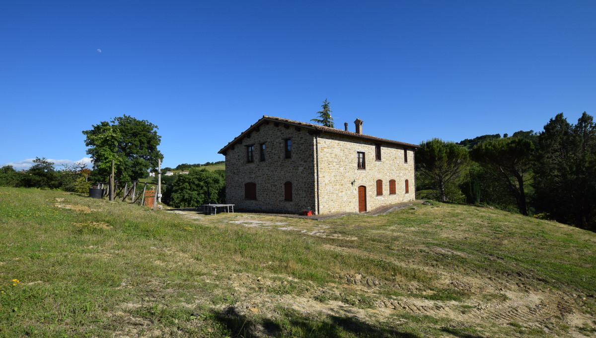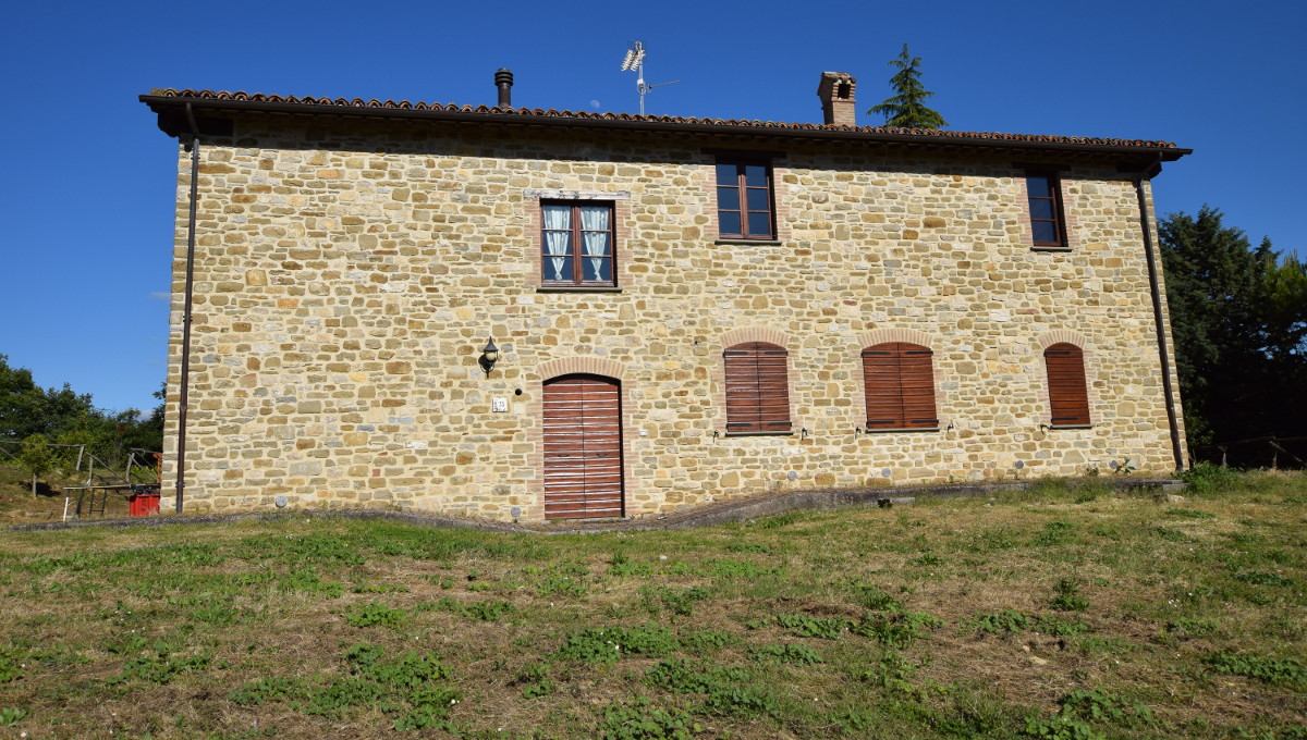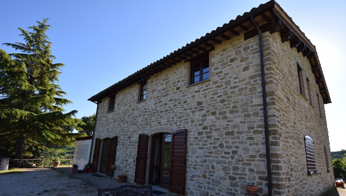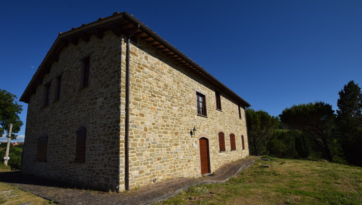 Il casale molto curato e con pregevoli finiture rappresenta la vecchia civiltà contadina umbra, totalmente in pietra a vista con solai e tetto in legno e pianelle a vista, si sviluppa su due piani, al piano terra con vari ingressi costituiti da porte finestre si trova un grandissimo salone con cucina professionale, una camera con tre bagni ed un wc, due di essi accessibili anche a portatori di handicap. Al piano primo si trovano quattro ampie camere matrimoniali tutte munite di bagno interno.