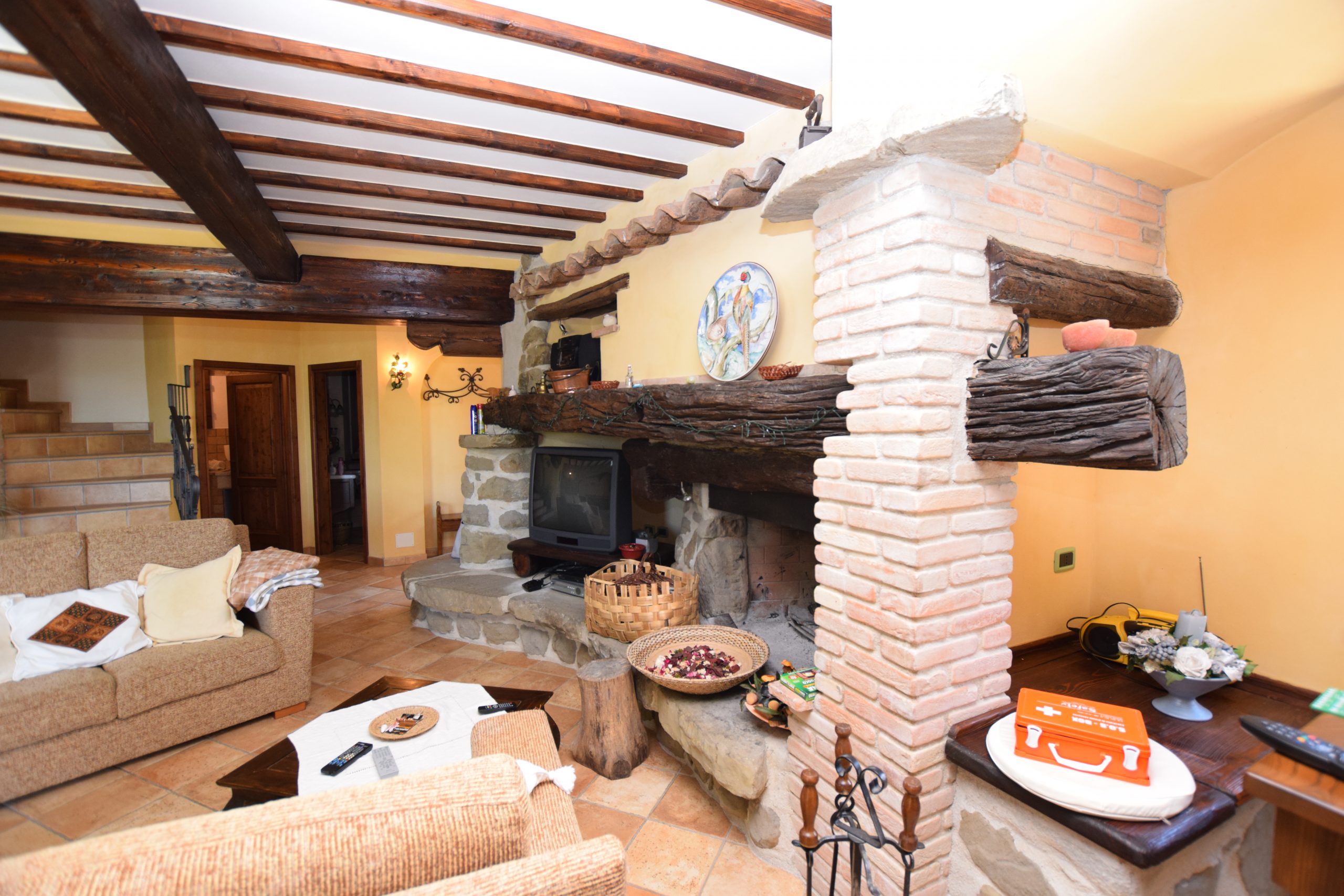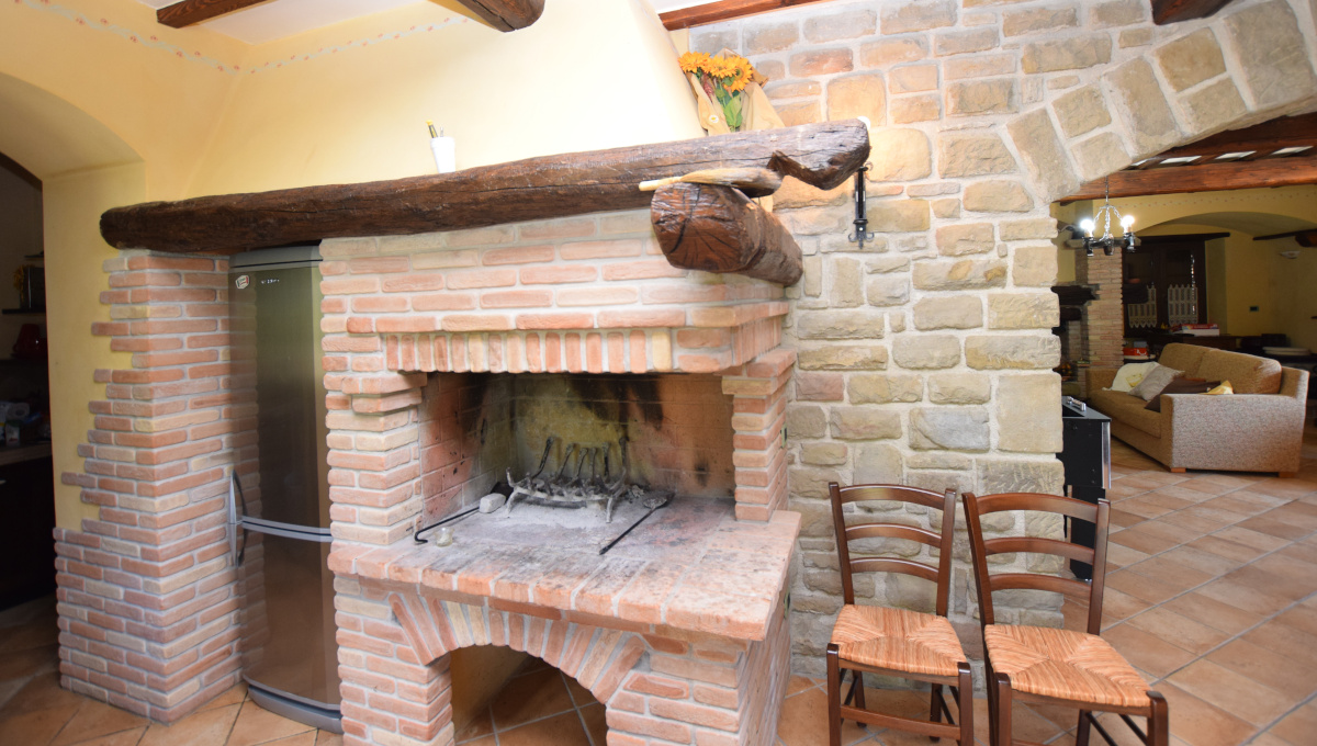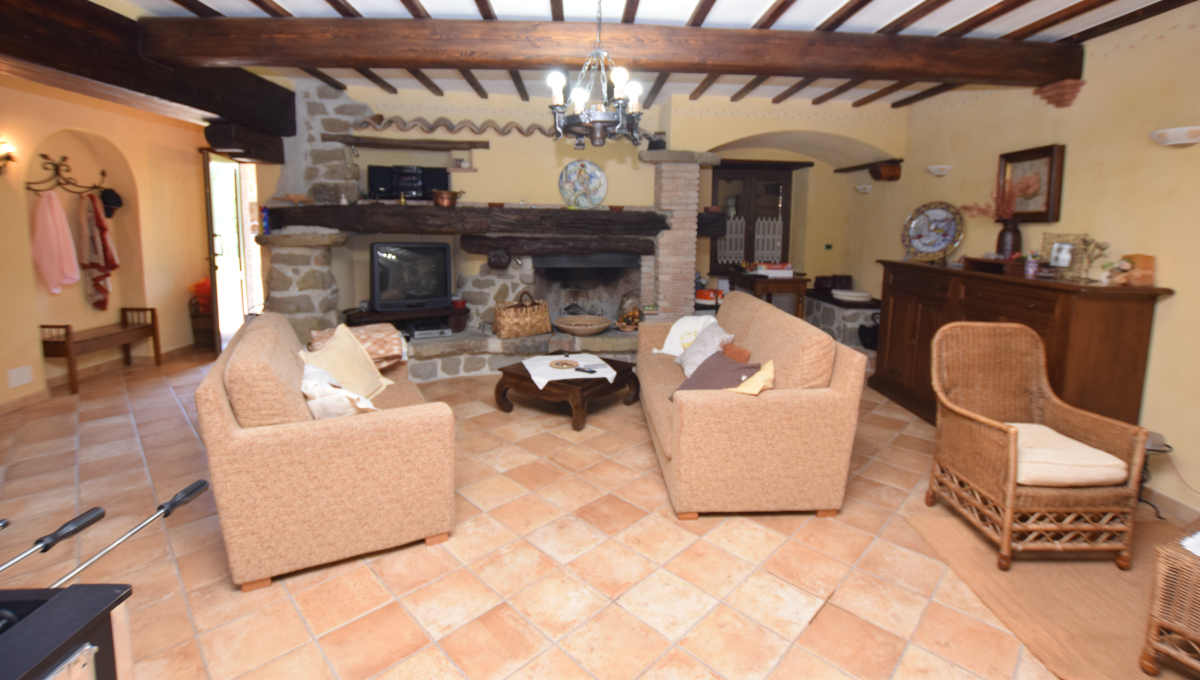 Il casale tutto in pietra a vista con tipologica scala esterna e balcone si sviluppa su una superficie disposta su due piani di metri quadrati 270 circa. Al piano terreno con ingrasso da porte finestre fronteggianti un grande lastrico solare si trova un ampio soggiorno con camino e cucina a vista ben arredata e attrezzata e con bagno. Una scala a vista fa raggiungere il piano superiore dove si trovano quattro camere matrimoniali, un tinello con cucina e due bagni,