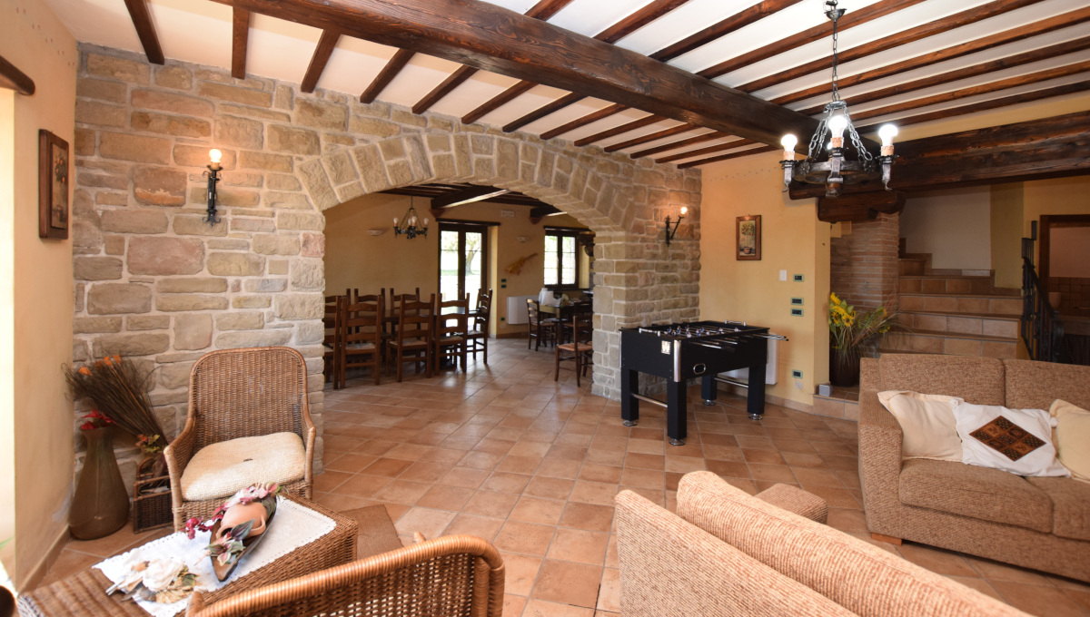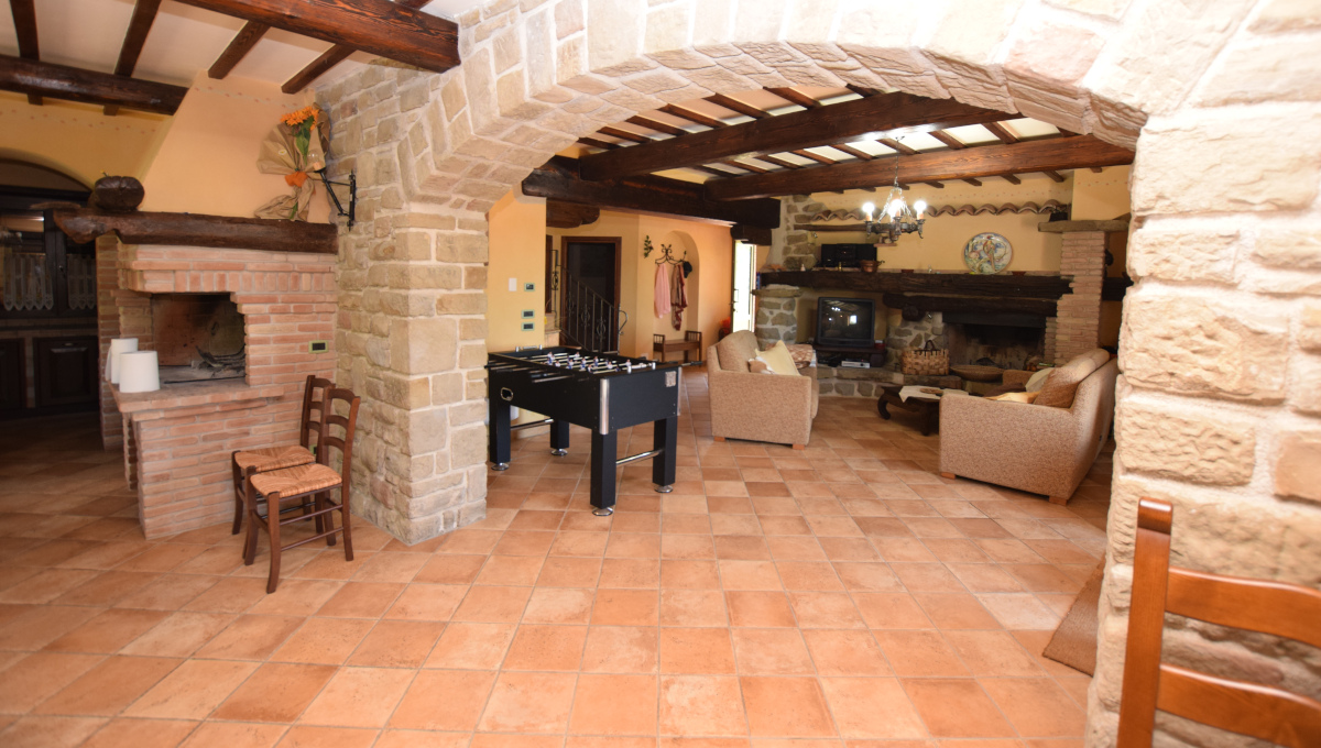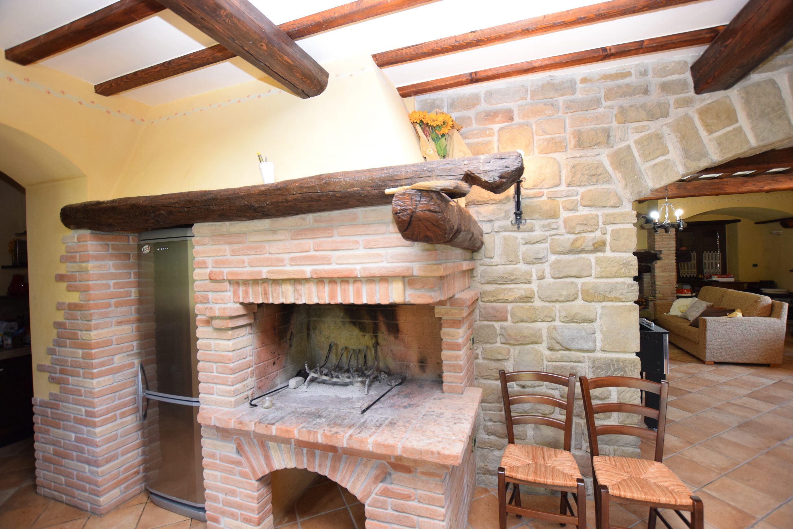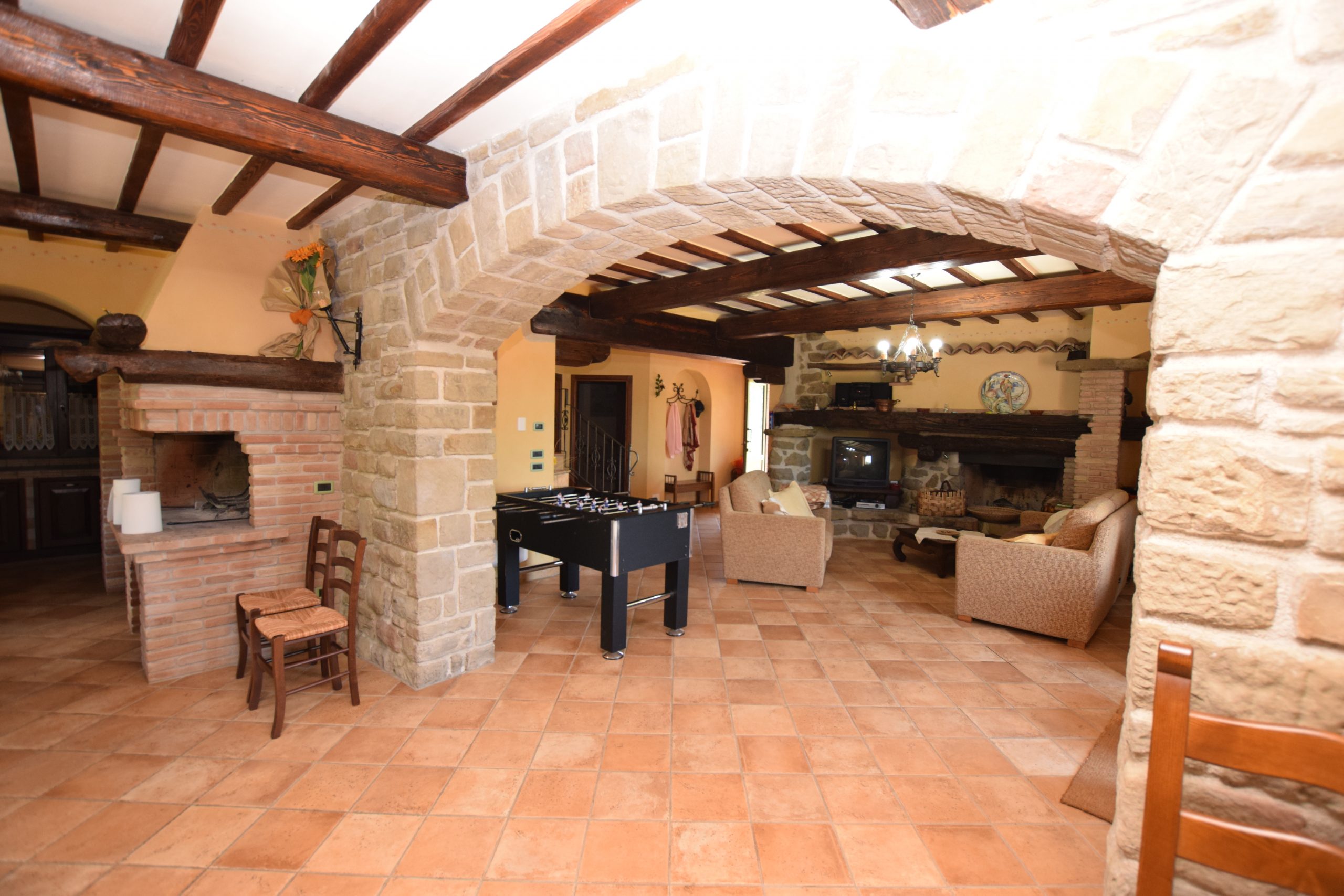 Il casale tutto in pietra a vista con tipologica scala esterna e balcone si sviluppa su una superficie disposta su due piani di metri quadrati 270 circa. Al piano terreno con ingrasso da porte finestre fronteggianti un grande lastrico solare si trova un ampio soggiorno con camino e cucina a vista ben arredata e attrezzata e con bagno. Una scala a vista fa raggiungere il piano superiore dove si trovano quattro camere matrimoniali, un tinello con cucina e due bagni,